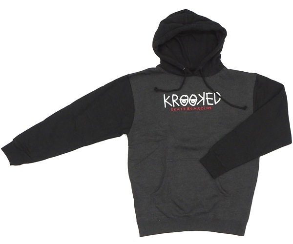 Krookedのプルオーバーのパーカーです。ボディーが濃いグレー、袖、フードが黒のツートンです。フロントプリントのみ。
